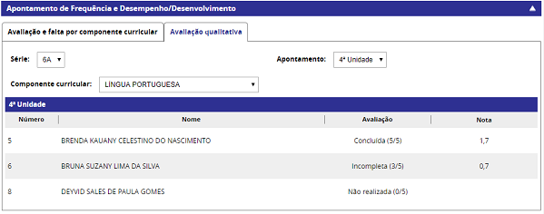 • Caso a turma já possua algum componente curricular com o apontamento concluído no período, será necessário informar a nota de todos os itens da avaliação qualitativa.