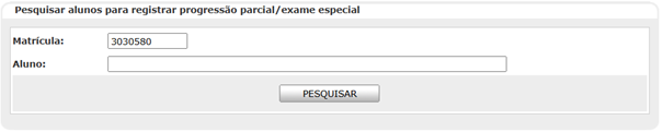 Pesquisar - Tela destinada à pesquisa de aluno para registrar progressão parcial/Exame especial. Os filtros Matrícula ou Aluno devem ser informados.