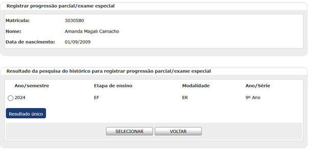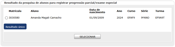 Selecione o aluno desejado, clique em SELECIONAR e a tela de registro de progressão parcial/Exame especial será exibida.