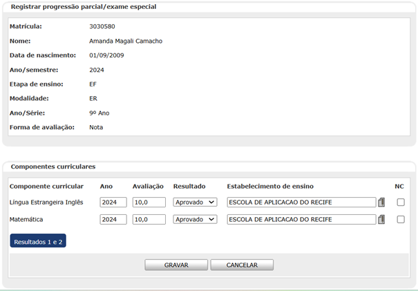 Na seção Registrar progressão parcial/Exame especial, os campos Matrícula, Nome, Data de nascimento, Ano/Semestre, Etapa de ensino, Modalidade, Ano/Série e Forma de avaliação serão exibidos preenchidos com os dados do aluno e bloqueados.