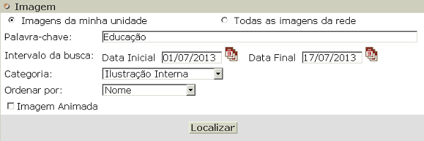 Localizar – Tela destinada a busca de uma imagem. Os filtros Palavra-chave, Intervalo da busca e Categoria podem ser informados. A opção ‘Imagens da minha unidade’ faz com que sejam exibidas apenas imagens incluídas na unidade de ensino do usuário. A opção ‘Todas as imagens da rede’ faz com que todas as imagens da rede que atendam os filtros da busca sejam exibidas. O campo Ordenar por pode ser informado e definirá como os resultados da busca serão ordenados. A opção ‘Imagem animada’ permite pesquisar apenas imagens animadas.
