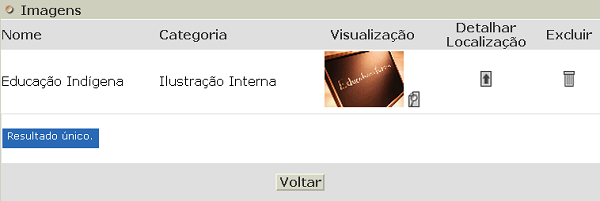 Excluir – Tela destinada a exclusão de uma imagem. A coluna Nome informa o título da imagem, a coluna Categoria indica em qual categoria a imagem foi inserida. Clique no ícone