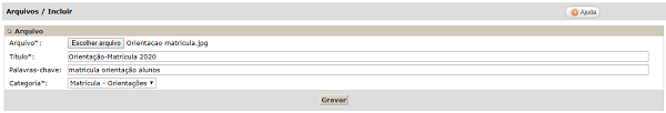 Incluir - Tela destinada à inclusão do arquivo para ser utilizado em outros aplicativos. Para isso, clique na aba Por unidade e Incluir, e a tela para inclusão será exibida. Os campos Arquivo, Título e Categoria devem ser informados. O campo Palavras-chave pode ser informado.