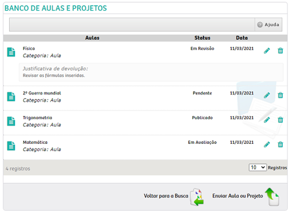 A tela exibirá as seguintes informações: título das ‘Aulas’ ou ‘Projetos’, status das ‘Aulas’ ou ‘Projetos’, data da última alteração e o ícone para ‘Editar’ ou ‘Excluir’.