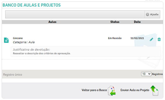 Enviar aula ou projeto - Tela destinada a enviar uma ‘Aula’ ou ‘Projeto’ para avaliação. Clique em Enviar Aula ou Projeto para enviar uma ‘Aula’ ou ‘Projeto’ para avaliação. Caso deseje retornar para tela de busca clique em Voltar para a Busca. Clique em Enviar e Alterar para mais informações.