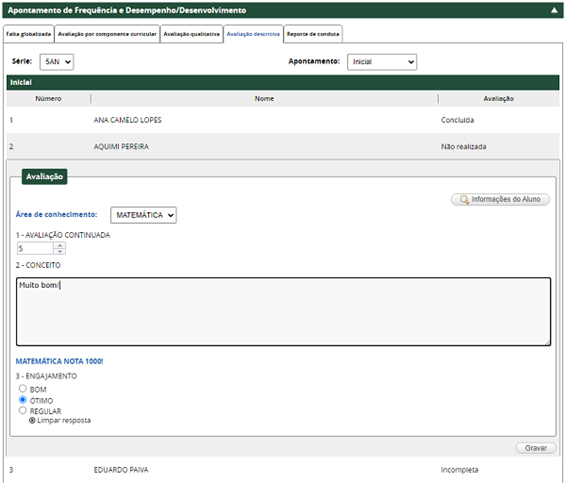 Permite efetuar o apontamento da avaliação descritiva dos alunos por meio de apontamento globalizado, independentemente do componente curricular.