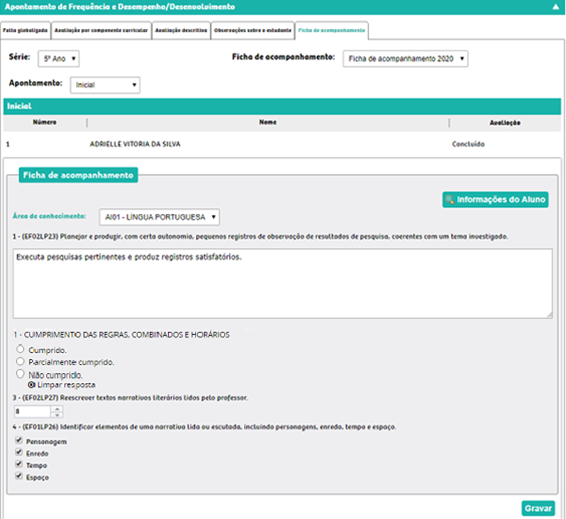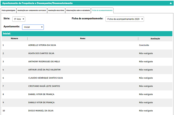 Permite efetuar o apontamento da ficha de acompanhamento dos alunos, podendo ser bimestral ou mensal.