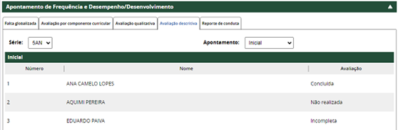 A coluna avaliação exibirá as seguintes situações: 'Concluída', 'Não realizada' e 'Incompleta'.