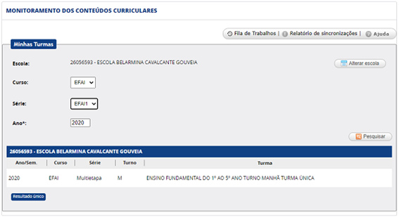 Pesquisar - Tela destinada a pesquisa das turmas para o apontamento dos conteúdos curriculares ministrados no período letivo vigente. O filtro Ano deve ser informado. Os filtros Curso e Série ajudam a refinar a busca. Clique em Pesquisar e a tela será exibida.