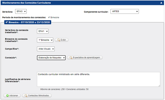 Clique em Adicionar e o apontamento de conteúdo curricular e as informações serão exibidas como conteúdos ministrados, abaixo da tela de inserção dos registros.