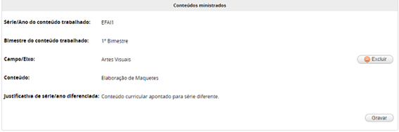 Excluir - Funcionalidade destinada excluir os conteúdos ministrados. Para excluir, clique no botão Excluir do conteúdo ministrado desejado.