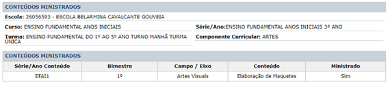Conteúdos ministrados -Exibe os conteúdos planejados para o componente curricular selecionado do ano letivo vigente, ou seja, mostra o planejamento de os bimestres/períodos. Após clicar em Conteúdos Ministrados, a janela com o conteúdo será exibida com as colunas Série/Ano conteúdo, Bimestre, Campo/ Eixo, Conteúdo, Conteúdo de análise linguística e indicando se o conteúdo foi ou não ministrado.