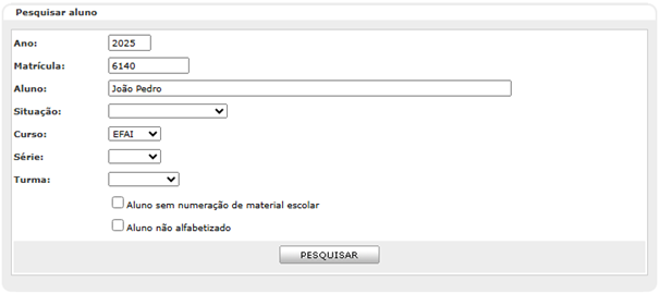 O filtro Alunos sem numeração de material escolar, quando selecionado, exibe no resultado da pesquisa apenas dos alunos sem numeração.
