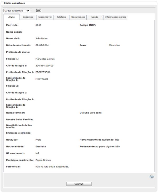 e a tela com os dados cadastrais do aluno será exibida. É possível visualizar outras informações dos alunos referente ao histórico de suas ocorrências e dados das matriculas ao se selecionar os dados desejados no campo. As opções de seleção são: 'Dados cadastrais', 'Dados de matrícula' e 'Dados históricos', após selecionar a opção desejada clique em OK para as respectivas telas serem mostradas.