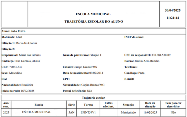 para gerar o documento TRAJETÓRIA ESCOLAR DO ALUNO, que contém informações matriculares do aluno na rede de ensino.
