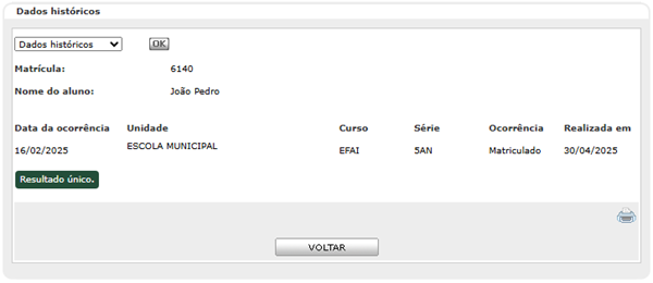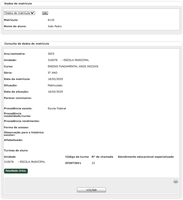 Aluno com situação 'Unificado' terá um campo com informações da matrícula do aluno que permaneceu ativo no sistema.