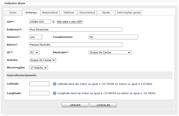 Aba Endereço - Tela destinada à alteração do endereço residencial do aluno.