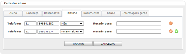 Aba Telefone - Tela destinada à alteração dos números de telefone do responsável, do próprio aluno ou número de telefones para recado (outro). É possível incluir até 10 números de telefones. Nessa tela as seguintes informações são solicitadas: Telefone e Recado para. Clique no ícone