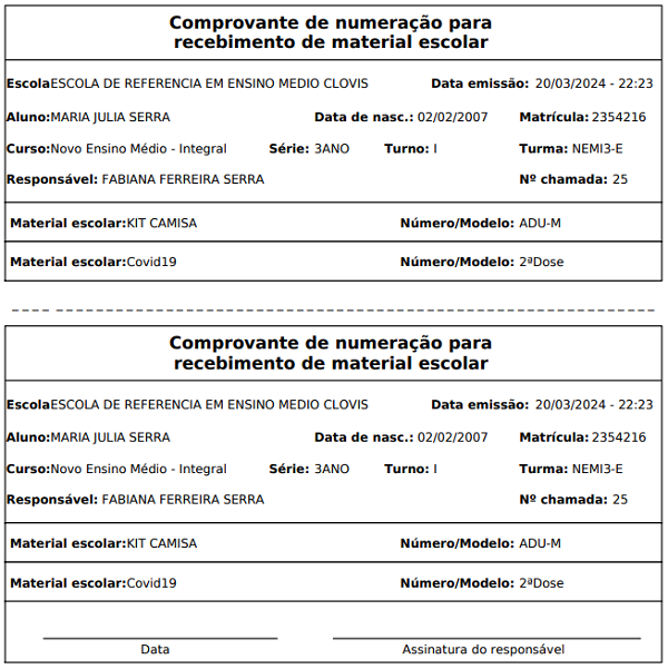 e será gerado o comprovante de numeração para recebimento de material escolar.