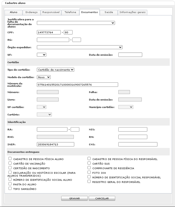 Na aba Aluno, mesmo que o campo Nacionalidade seja diferente de ‘Brasileira’ ou ‘Brasileira nascido no exterior/naturalizado’, o campo CPF não será bloqueado.