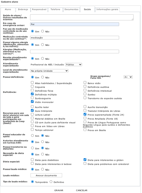Aba Saúde – Tela destinada aos dados de saúde do aluno.