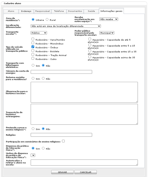 Aba Informações gerais - Tela destinada à alteração das informações gerais do Educacenso e material escolar. Nesta tela, devem ser informados os campos Zona de residência, Recebe escolarização em outro espaço, Localização diferenciada, Transporte escolar, Poder público responsável pelo transporte escolar, Número da conta de energia, Retorna sozinho para a residência, Observação para o histórico escolar, Pretende cursar o ensino religioso, Religião, Autorizados a retirar o aluno da escola e Material escolar.