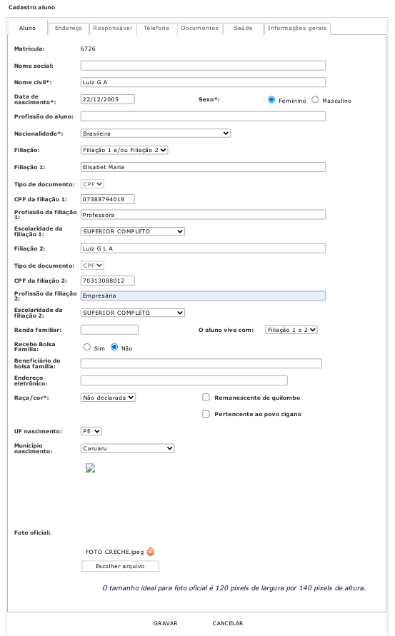 Para campo Foto oficial, – clique em Escolher arquivo, selecione o arquivo da imagem que deseja colocar no cadastro do aluno, e respeite o tamanho máximo de 120 pixels de largura por 140 pixels de altura.