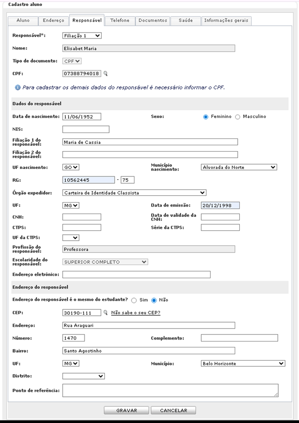 Se o campo Responsável for informado como ‘Filiação 1’ ou ‘Filiação 2’ e o CPF estiver preenchido, os campos Nome, Profissão do responsável e Escolaridade do responsável serão bloqueados e preenchidos automaticamente com os dados da aba Aluno.