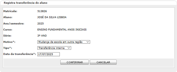 e a tela para registrar a transferência será exibida. Os campos Motivo, Tipo e Data de transferência devem ser informados. Transferência interna é a transferência para outra escola da rede de ensino e transferência externa é a transferência para escola fora da rede de ensino. O campo Data de transferência não pode ser menor que a data da matrícula, e maior que a data atual (data do dia de acesso ao sistema). A transferência deve ocorrer após a data de situação do aluno, ou seja, a data deve ser maior que a data de abandono e/ou matrícula.