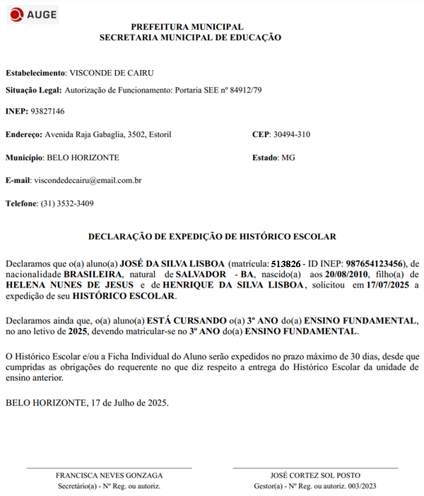 Para alguns clientes, após realizada a operação de transferência do aluno, o sistema exibirá a mensagem de confirmação com a opção de imprimir a declaração de transferência e, caso o usuário confirme, o sistema irá gerar a declaração de transferência do aluno.
