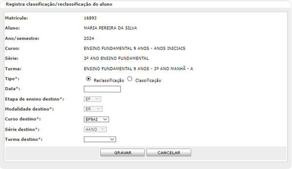 Permite registrar a classificação do aluno, que corresponde ao seu posicionamento inicial em determinado ano ou série escolar, definido a partir de critérios específicos.