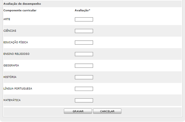 o Este campo deve ser informado. Para cada componente curricular listado, será exibido um campo para o registro das notas. Os valores permitidos para as notas serão compatíveis com os campos Valor máximo da nota e Número de casas decimais definidos na tela Parâmetros (Gerenciador de Acesso > Parâmetros).
