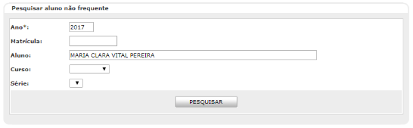 Pesquisar - Tela destinada à pesquisa de aluno com situação não frequente. O filtro Ano deve ser informado. Os filtros Matrícula, Aluno, Curso e Série, ajudam a refinar a busca.