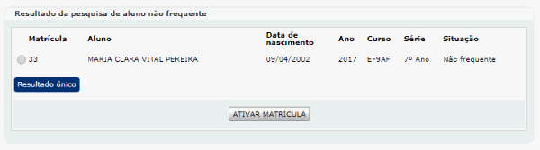 • No caso de Aluno não frequente, a matrícula pode ser ativada somente para o mesmo período letivo e para a mesma escola e curso em que o aluno foi colocado como não frequente. Caso o curso esteja encerrado, o aluno deve ser matriculado na tela matrícula de aluno.