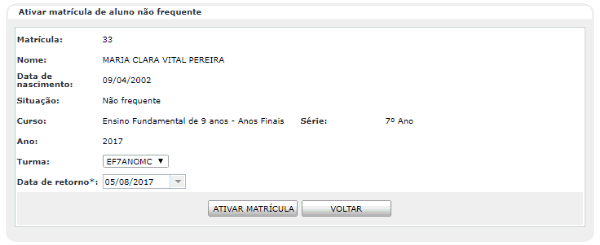 Permite ativar a matrícula de um aluno com situação não frequente. As frequências e notas lançadas antes da ativação da matrícula não geram pendência para o aluno. Os bimestres anteriores ao seu retorno terão os campos desabilitados. Só serão cobradas pendências deste aluno após a data de ativação da matrícula. Após a ativação, a situação do aluno passará a ser matriculado no ano corrente da data de retorno.