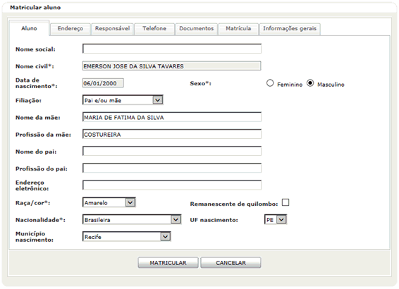Aba aluno - Tela destinada ao cadastro das informações do aluno: filiação, se a opção selecionada for ‘Pai e/ou mãe’ será necessário preencher pelo menos uns dos campos, nome da mãe ou nome do pai. Se a opção selecionada for ‘Não declarado/ ignorado’ os campos ‘Nome da mãe’ e ‘Nome do pai’ ficarão desabilitados e o responsável não poderá ser a mãe ou o pai. Profissão da mãe, profissão do pai, endereço eletrônico (e-mail), raça/cor, remanescente de quilombo, nacionalidade, UF nascimento e município nascimento são outros campos da tela a serem preenchidos.