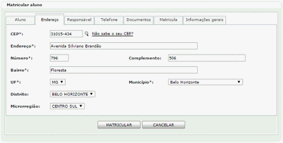 Aba endereço - Tela destinada ao cadastro do endereço residencial do aluno. Nesta tela as seguintes informações são solicitadas: CEP, endereço, número, complemento, bairro, UF, município, distrito. Ao preencher o CEP, os campos do endereço, bairro, UF, município serão preenchidos automaticamente. Para isso, clique em Preencher Endereço no ícone . Caso o usuário não saiba o CEP, clique em Não sabe o seu CEP?, preencha os campos e clique em Pesquisar. O sistema responderá à pesquisa com o CEP cadastrado para o endereço pesquisado, selecione o CEP e clique em Selecionar. Os campos do endereço, bairro, UF e município serão preenchidos automaticamente. Caso não haja alguma dessas informações na base dos Correios, o campo não será preenchido. O campo Microrregião tem suas opções cadastradas pela Rede de Ensino e pode ter opções diferentes se o Distrito for alterado.