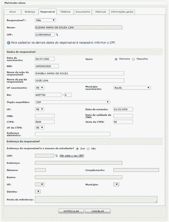 Endereço do responsável: Endereço do responsável é o mesmo do estudante? Sim ou Não, se marcar sim desabilita os campos a seguir, CEP, Endereço, Número, Complemento, Bairro, UF, Município, Distrito, Ponto de referência.