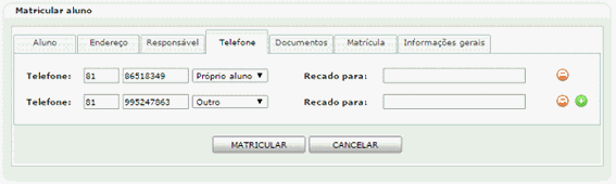 Aba telefone - Tela destinada ao cadastro dos números de telefone do responsável ou número de telefones para recado. É possível cadastrar até 10 números de telefones. Nesta tela as seguintes informações são solicitadas: Telefone e Recado para.