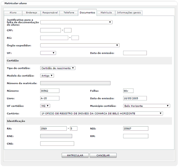 Podem ser preenchidos os dados da certidão de casamento do aluno, ao invés da certidão de nascimento. Modelo da certidão se é antigo ou novo, no caso do modelo novo, o sistema verifica se o número da matrícula é válido. Se a opção selecionada for antiga, informar: Número, folha, livro, data de emissão, UF certidão, município certidão e Cartório.