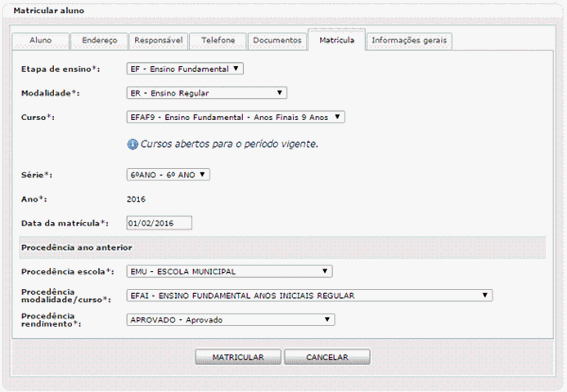 Aba matrícula - Tela destinada aos dados da matrícula do aluno. Nesta tela as seguintes informações são solicitadas: Etapa de ensino, Modalidade, Curso – só ficarão disponíveis, a partir das Etapas e Modalidades, os cursos abertos na escola, Série, Ano e Semestre - serão exibidos o ano e semestre de abertura do curso selecionado, Data matrícula - o usuário só pode informar datas anteriores ou igual à data atual, Procedência ano anterior, Procedência escola, Procedência modalidade/curso, Procedência rendimento.
