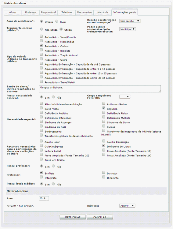 Aba informações gerais - Tela destinada aos dados do Educacenso, da saúde do aluno e de material escolar. Nesta tela as seguintes informações são solicitadas: