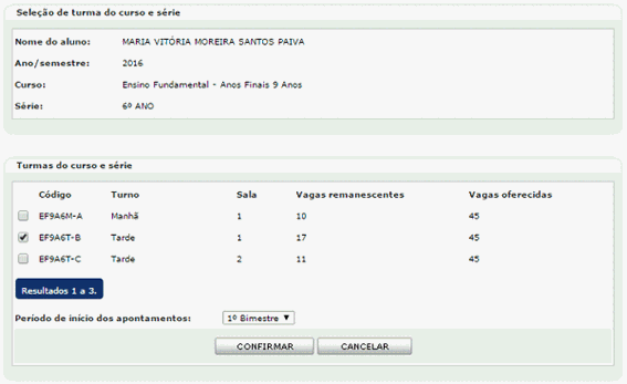 Seleção de turma - Tela destinada a enturmação de novo aluno na rede de ensino. Para isso, é preciso selecionar a turma na qual o aluno será enturmado. Caso não seja selecionada a turma, o aluno será apenas matriculado e não será enturmado.