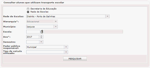 Pesquisar – Tela destinada à consulta de alunos que utilizam transporte escolar. Selecione a unidade para a pesquisa: Secretaria de Educação ou Rede de Escolas.