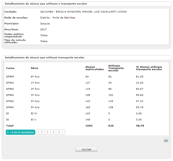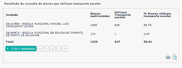 Permite consultar a quantidade de alunos que utilizam o transporte escolar por unidade escolar e por curso/série. É permitido também verificar a quantidade de alunos que utilizam o transporte escolar por poder público e por tipo de veículo utilizado. Para gerar os resultados da consulta, o sistema utiliza a informação do cadastro do aluno, ou seja, a mesma informação que é enviada para censo escolar.
