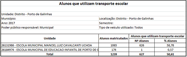 e a planilha será exibida com as colunas Unidade, Alunos matriculados, Alunos que utilizam transporte público – Nº Alunos - %Alunos.