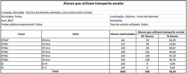 e a planilha será exibida com as colunas Curso, Série, Alunos matriculados e Alunos que utilizam transporte escolar – Nº Alunos - % Alunos.