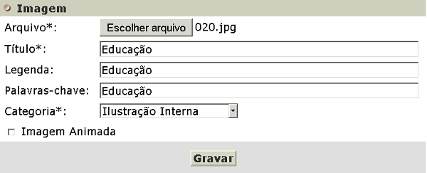 Incluir – Funcionalidade destinada à inclusão de imagens. Os campos Arquivo, Título e Categoria devem ser preenchidos. Os campos Legenda, Imagem animada e Palavra-chave podem ser preenchidos.