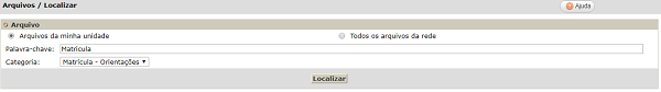 Localizar - Tela destina à localização dos arquivos inseridos. Selecione uma das opções ‘Arquivo da minha unidade’ ou ‘Todos os arquivos da rede’. Os campos Palavra-chave e Categoria podem ser informados.