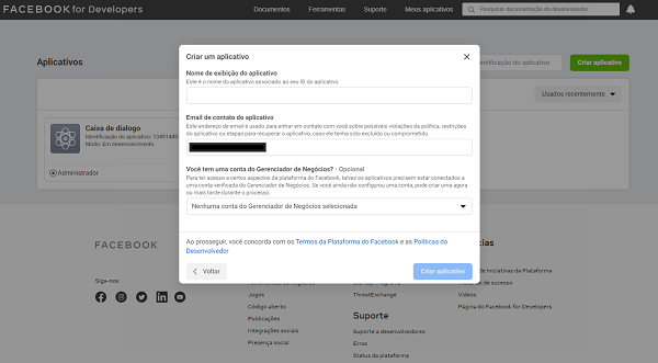 Os campos Nome de exibição do aplicativo e Email de contato do aplicativo são de preenchimento obrigatório. Caso possua uma conta de gerenciador de negócios do Facebook, ela poderá ser informada no campo Você tem uma conta de Gerenciador de Negócios?.